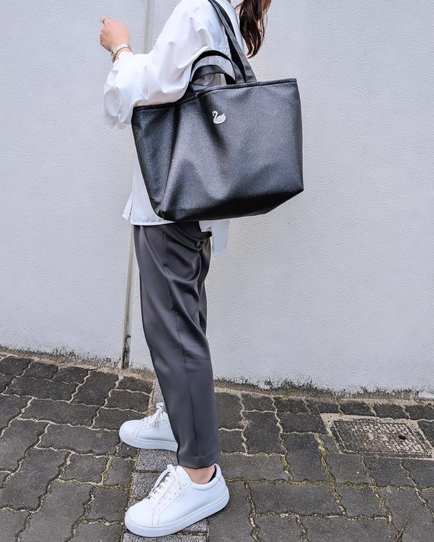 汚れもコーデも何も気にする事のない、万能トートバッグです。重くなりがちなブラックバッグも上品なラメのおかげで抜け感を出してくれます。